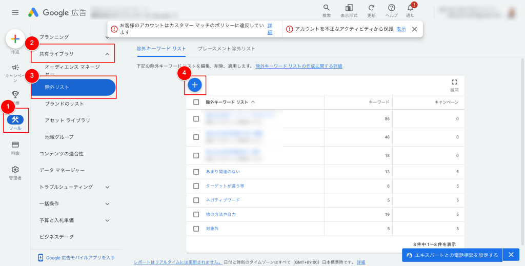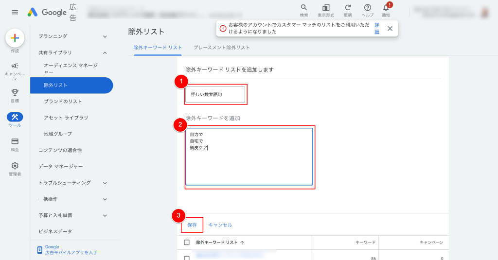 除外キーワードの作業で手っ取り早い方法は除外リストを使う方法です。
